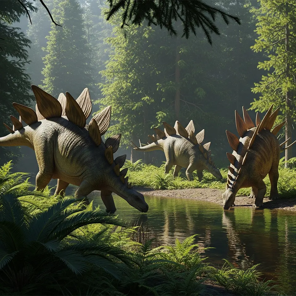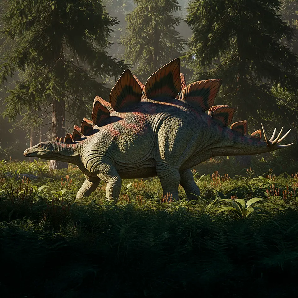 Stell dir vor: Vor über 150 Millionen Jahren durchstreifte ein sanfter Riese die Farnwälder der Jurazeit: der Stegosaurus. Mit seinem massiven Körper, den eleganten Rückenplatten und dem typischen gewölbten Rücken war er ein eindrucksvolles Wesen. Doch trotz seiner imposanten Größe war der Stegosaurus ein friedvoller Pflanzenfresser. Er ernährte sich von Moosen, Farnen, Palmblättern und anderen Pflanzen der Urzeit. Mit kleinen, zarten Zähnen knabberte er behutsam am Grün und zog seine Nahrung aus der Erde ganz im Einklang mit der Natur. In einer längst vergangenen Welt zeigte er uns, dass Macht und Stärke nicht mit Aggression einhergehen müssen, sondern mit Ruhe und Harmonie.